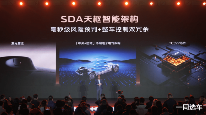 辅助驾驶方面,基于SDA天枢智能架构,搭载激光雷达,采用SDA“中央+区域”环网电子电气架构,左右区域控制器均搭载英飞凌旗舰“芯”脏TC399,实现毫秒级风险预判+整车控制双冗余。