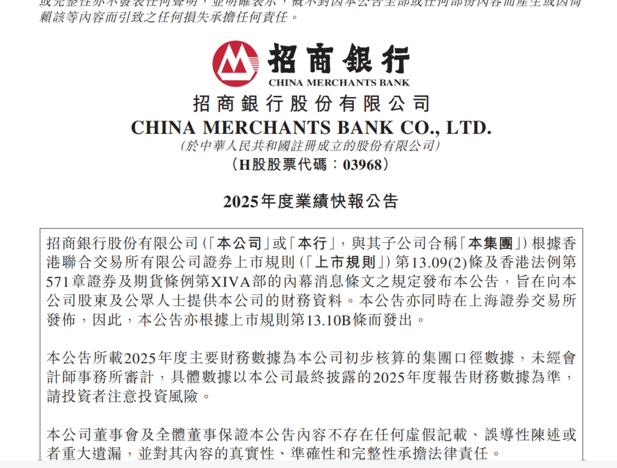 截至2025年12月31日,招商银行资产总额13.07万亿元,较上年末增加9184.87亿元,增幅7.56%;负债总额11.79万亿元,较上年末增加8710.63亿元,增幅7.98%;不良贷款率0.94%,较上年末下降0.01个百分点;拨备覆盖率391.79%,较上年末下降20.19个百分点;贷款拨备率3.68%,较上年末下降0.24个百分点。